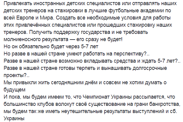 Также, по мнению СаШо, необходимо привлекать для обучения нового поколения юных футболистов иностранных специалистов, либо отправлять на стажировки в лучшие футбольные страны мира украинских тренеров.