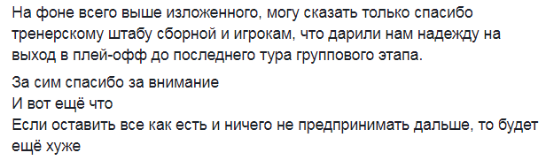На фоне всего вышеизложенного, могу сказать только спасибо тренерскому штабу сборной и игрокам, что дарили нам надежду на выход в плей-офф до последнего тура группового этапа.