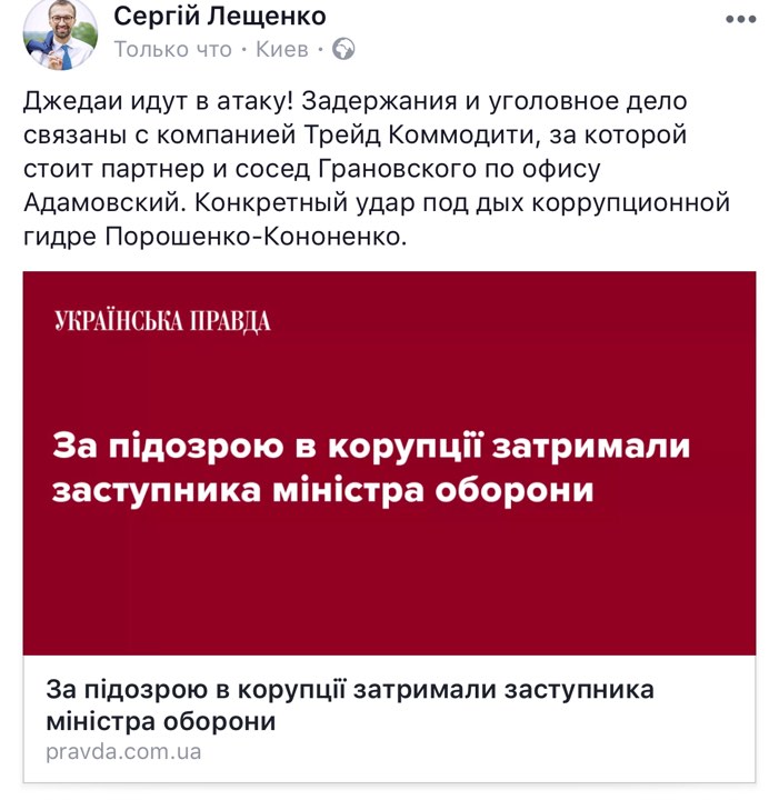 По данным же нардепа Сергея Лещенко, задержания в Минобороны связаны "с компанией Трейд Коммодити, за которой стоит партнер и сосед Грановского по офису Адамовский. Конкретный удар под дых коррупционной гидре Порошенко-Кононенко".