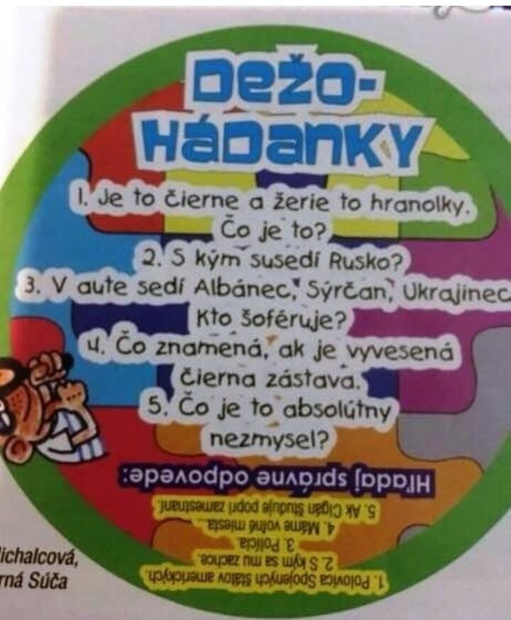 В журнале детям предлагают отгадать загадки, ответы на которые носят сомнительный характер. На загадку "это черное и ест картофель фри", правильным ответом указана "половина США". Другие примеры: "В машине сидят албанец, сириец, и украинец. Кто водитель?". Ответ журнала – "Полицейский".