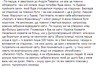 "На самом деле я хорошо смотрел и видел только первый тайм. К сожалению во время перерыва, я не знаю кто не сработал, но возникла такая ситуация, что какая-то куча отбросов, разметая на своем пути детей, буцая их ногами, вломилась в сектор, где находились болельщики СК "Днепр-1". А мы сегодня играли в гостях, и наши болельщики были компактно рассажены. Я не знаю, как это квалифицировать, но из-за то, что творится на стадионе, должны вернуться правоохранители!, - сказал Береза и добавил, на футбол приехали 700 детей из сельских школ области, в том числе из интернатов.