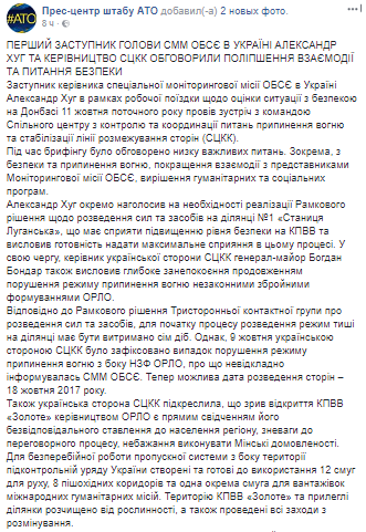 11 октября первый заместитель главы СММ ОБСЕ в Украине Александр Хуг обсудил возможное разведение сил на участке "Станица Луганская" с командой Совместного центра по контролю и координации вопросов прекращения огня. Об этом говорится на странице пресс-центр штаба АТО в Facebook.