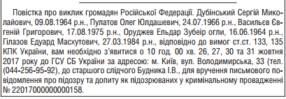 "Российский военный, бывший начальник разведки так называемой "ДНР" Сергей Дубинский (позывные "Петровский" и "Хмурый"), 9 августа 1964 года рождения, вызывается в Главное следственное управление СБУ на 26-31 октября для вручения сообщения о подозрении и допроса", - сказано в опубликованной повестке.