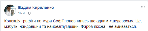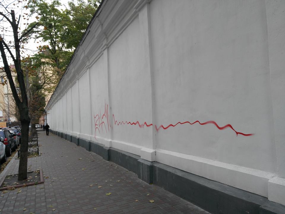 "Коллекция граффити на стене Софии пополнилась еще одним "шедевром". Это, наверное, самый длинный и самый бессмысленный. Краска качественная – не смывается", – говорит Кириленко.