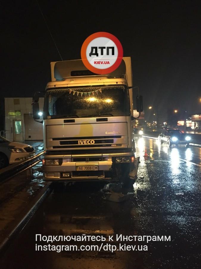 Вечером 11 октября масштабное ДТП случилось в Киеве в Оболонском районе - на улице Богатырской на подъезде к метро Петровка седельный тягач Iveko допустил столкновение сразу с тремя легковыми автомобилями.