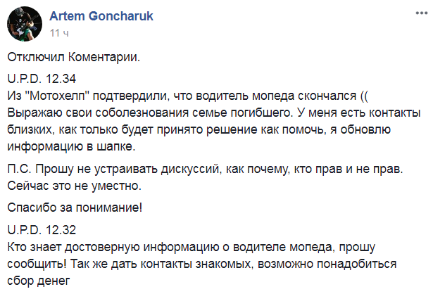Как сообщала "Страна", скутериста под Киевом сбил внук генерала Радченко на Mercedes-Benz. Водитель скутера сворачивал с дамбы в сторону Киева на перекрестке и в этот момент на встречной полосе, по предварительной информации, водитель внедорожника Mercedes-Benz обогнал авто, которое стояло впереди, и выехал на встречную полосу, где сбил скутер.
