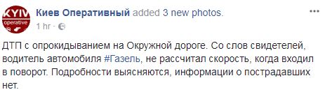 В Киеве на Кольцевой дороге утром произошло ДТП с участием грузового автомобиля "Газель". Об этом сообщает на своей странице в Facebook сообщает "Киев Оперативный".