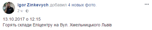 Во Львове, 13 октября, возник пожар на складах строительного супермаркета "Эпицентр" на улице Богдана Хмельницкого, 18. Об этом сообщает руководитель ОО "Варта 1" Игорь Зинкевич на своей странице в Facebook.