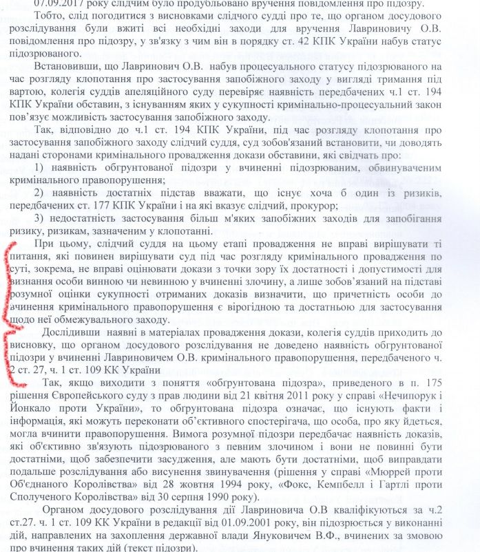 При этом, суд пришел к выводу, что органом досудебного расследования не доказано наличие обоснованного подозрения в совершении Александром Лавриновичем уголовного правонарушения, предусмотренного ч. 2 ст. 27, ч. 1 ст. 109 Уголовного кодекса Украины.