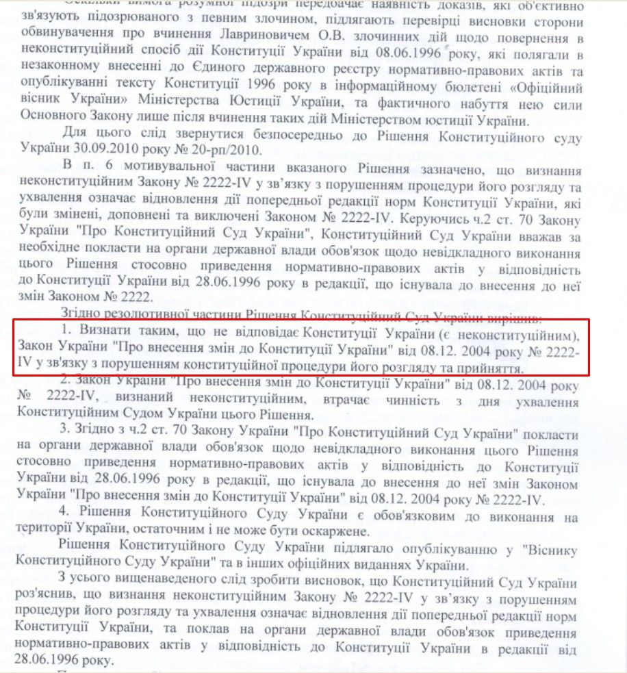 Анализируя решение Конституционного суда Украины от 30.09.2010 года №20-рп/2010, суд также пришел к выводу, что "…Конституционный Суд Украины разъяснил, что признание неконституционным закона №2222-IV в связи с нарушением процедуры его рассмотрения и принятия означает восстановление действия предыдущей редакции норм Конституции Украины, и возложил на органы государственной власти обязанность приведения нормативно-правовых актов в соответствие с Конституцией Украины в редакции от 28.06.1996 года".