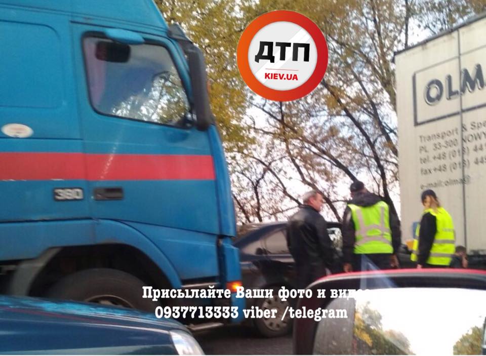 В Киеве две фуры зажали легковушку на Окружной, участок дороги сковало пробкой