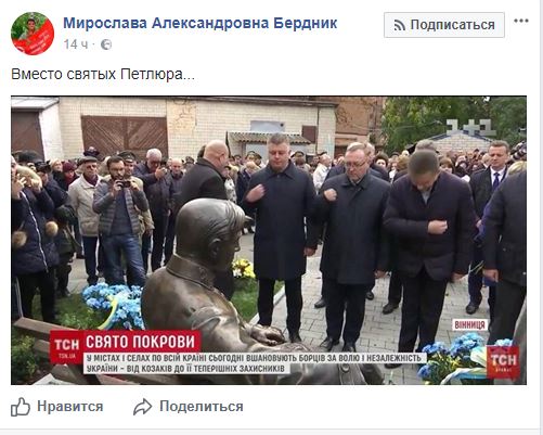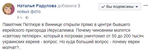 "Памятник Петлюре в Виннице открыли прямо в центре бывшего еврейского пригорода Иерусалимка. Почему чиновники молятся "святому петлюре", который в погромах уничтожил от 50 до 200 тысяч украинских евреев - вопрос. Но куда больший вопрос - почему евреи молчат?.."