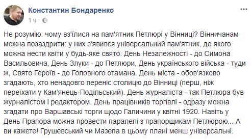 "Не понимаю: почему взъелись на памятник Петлюре в Виннице? Жителям можно позавидовать: у них появился универсальный памятник, к которому можно нести цветы в любой праздник. День Независимости - Симону Васильевичу, День Соборности - к Петлюре, День украинского войска - туда же, Праздник Героев - к Главному атаману. День города - обязательно вспомнят, кто ненадолго перенес столицу в Винницу (прежде, чем переехать в Каменец-Подольский). День журналиста - так Петлюра был журналистом и редактором. День работников торговли - сразу можно вспомнить о Варшавских торгах по Галичине в апреле 1920. Даже в День Флага можно провести параллели с прапорщиком Петлюрой ...