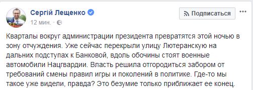 "Кварталы вокруг администрации президента превратятся этой ночью в зону отчуждения. Уже сейчас перекрыли улицу Лютеранскую на дальних подступах к Банковой, вдоль обочины стоят военные автомобили Нацгвардии", - написал Лещенко.