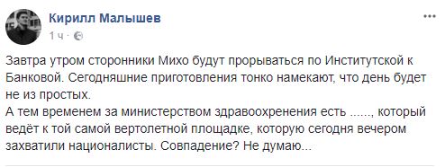 "Завтра утром сторонники Михо будут прорываться по Институтской к Банковой. Сегодняшние приготовления тонко намекают, что день будет не из простых (речь о Нацгвардии по периметру правительственного квартала - ред). А тем временем за министерством здравоохренения есть ......, который ведёт к той самой вертолетной площадке, которую сегодня вечером захватили националисты. Совпадение? Не думаю...", - пишет журналист в Facebook.