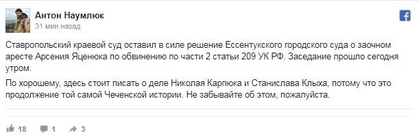 "По хорошему, здесь стоит писать о деле Николая Карпюка и Станислава Клыха, потому что это продолжение той самой Чеченской истории. Не забывайте об этом, пожалуйста", – отмечает журналист.