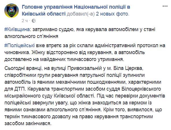 Управляла машиной судья Белоцерковского горрайонного суда Киевской области. Во время проверки документов полицейские обратили внимание на явные признаки алкогольного опьянения у женщины, передает на Facebook пресс-служба ГУ полиции Киевской области.