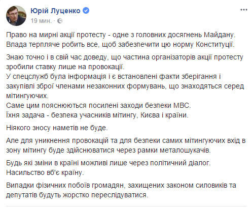 "Власть терпеливо делает все, чтобы обеспечить эту норму Конституции. Знаю точно и в свое время докажу, что часть организаторов акции протеста сделали ставку только на провокации. У спецслужб была информация и является установлены факты хранения и закупки оружия членами незаконных формирований, находящихся среди митингующих. Именно этим объясняются усиленные меры безопасности МВД. Их задача - безопасность участников митинга, Киева и страны. Никакого сноса палаток не будет", - написал он.