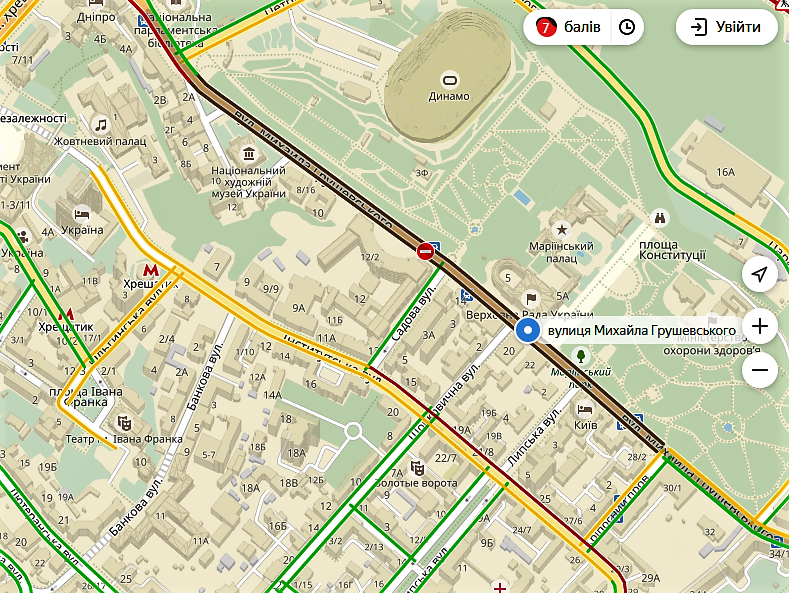 В Киеве затруднено движение по улице Грушевского от стадиона "Динамо" им. В.Лобановского, Бассейной, Большой Васильковской от площади Льва Толстого до бульвара Тараса Шевченко.