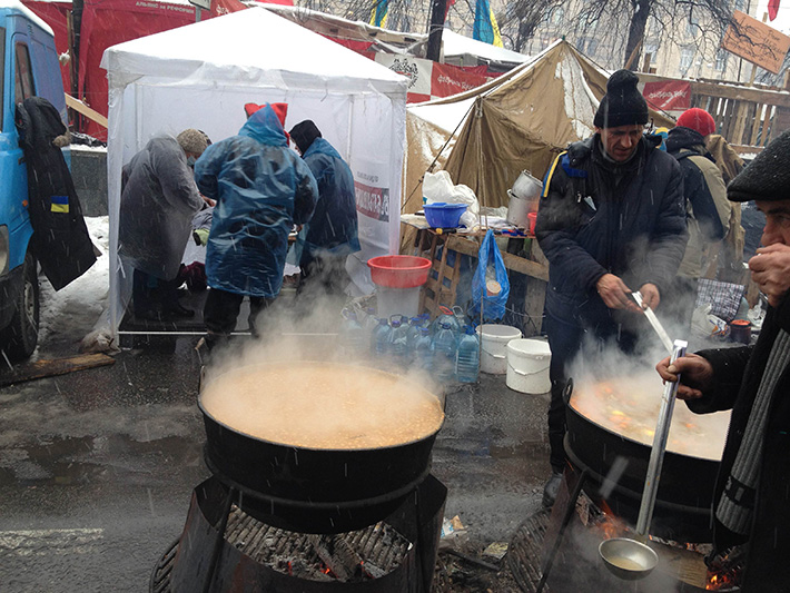 Во время протестов на Майдане с ноября 2013 по февраль 2014 года были развернуты большие полевые кухни. Люди везли протестующим продукты питания, консервацию. Приносили много хлеба, печенья, готовой еды – пирожки, голубцы, булочки. Волонтеры на приеме продуктов рассказывали, что люди приносили все – вплоть до кастрюль с борщом, коробок с пиццей и пакетов из "МакДональдса".