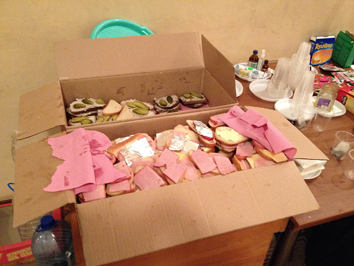Если акция длится весь день, организаторы и сочувствующие подвозят ингредиенты для бутербродов. Нарезанный хлеб, недорогая колбаса, ну а если еще слайс огурца – считай, начался пир. "Бутики" готовят сами митингующие, это близкий к сакральному процесс.