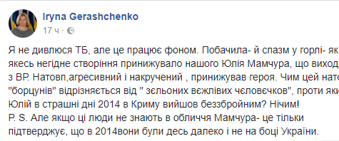 Первый вице-спикер парламента Ирина Геращенко заявила, что Мамчура "унижало какое-то недостойное существо".