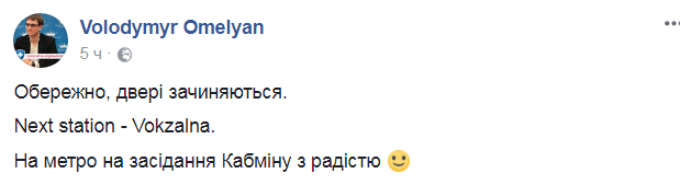"Осторожно, двери закрываются. Следующая станция - Вокзальная. На метро на заседание Кабмина с радостью", - написал министр.
