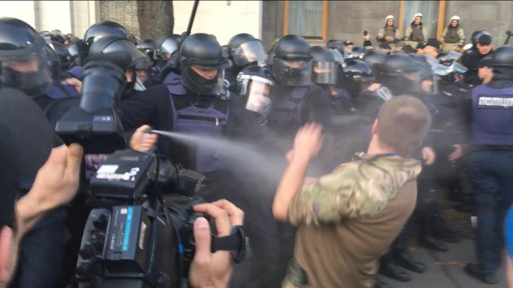 Вечером в Киеве у стен Верховной Рады началась потасовка между полицией и протестующими активистами, в результате которой начались первые задержания.
