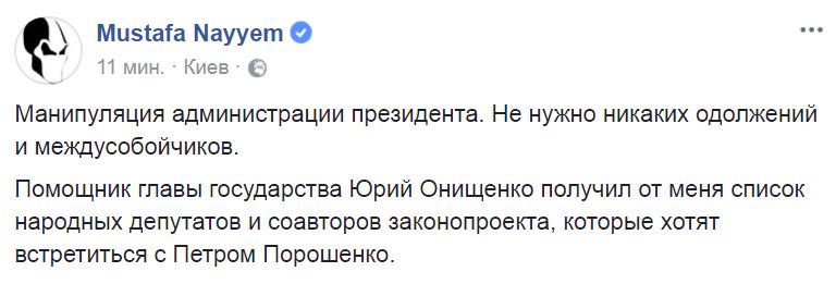 "Манипуляция администрации президента, - написал нардеп в ФБ. - Не нужно никаких одолжений и междусобойчиков. Помощник главы государства Юрий Онищенко получил от меня список народных депутатов и соавторов законопроекта, которые хотят встретиться с Петром Порошенко".