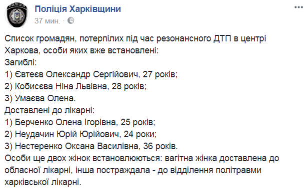 Поздним вечером среды, 18 октября появился список пострадавших в результате кровавого ДТП на ул. Сумской в Харькове. Это только те люди, личности которых удалось установить.