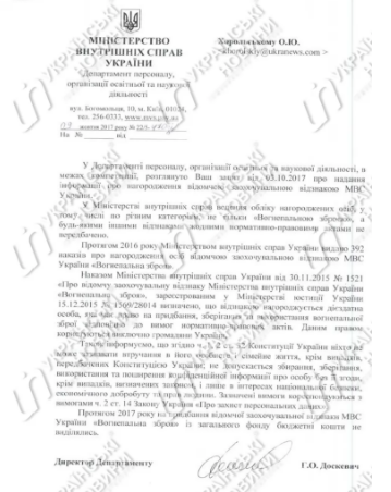 "В Министерстве внутренних дел Украины ведение учета награжденных лиц, в том числе по разным категориям, не только "Огнестрельным оружием", а какими-либо другими отличиями, ни какими нормативно-правовыми актами не предусмотрено", - говорится в ответе МВД.