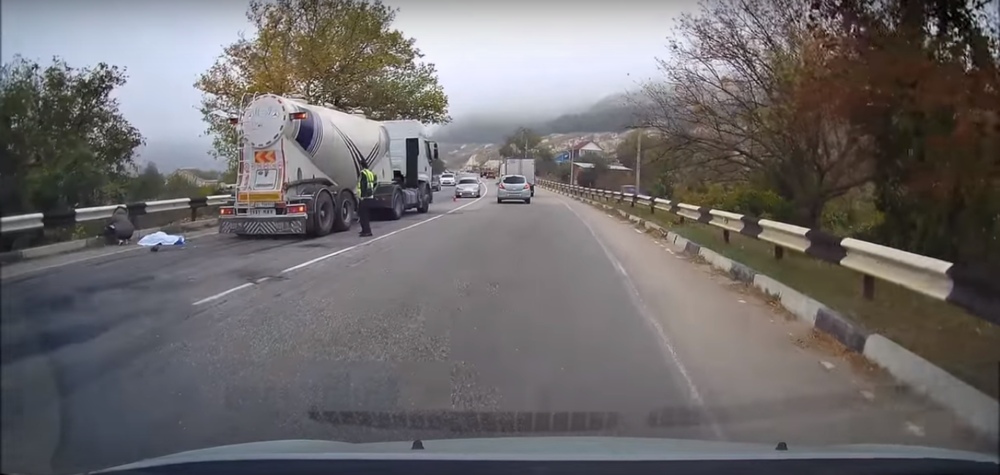На видеозаписи с места аварии хорошо видны следы от покрышек цементовоза, судя по которым водитель до последнего пытался затормозить.