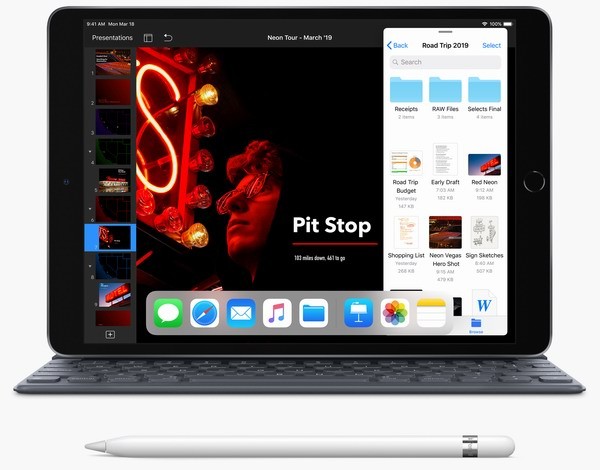 Retina-дисплей на 10,5 дюйма поддерживает TrueTone и стилус Apple Pencil первой версии, а также увеличенное до 2224×1668 пикселей разрешение. Чтобы разблокировать работу новый iPad использует сканер пальца, встроенный в кнопку "Домой". Технология Face ID в нем отсутствует.