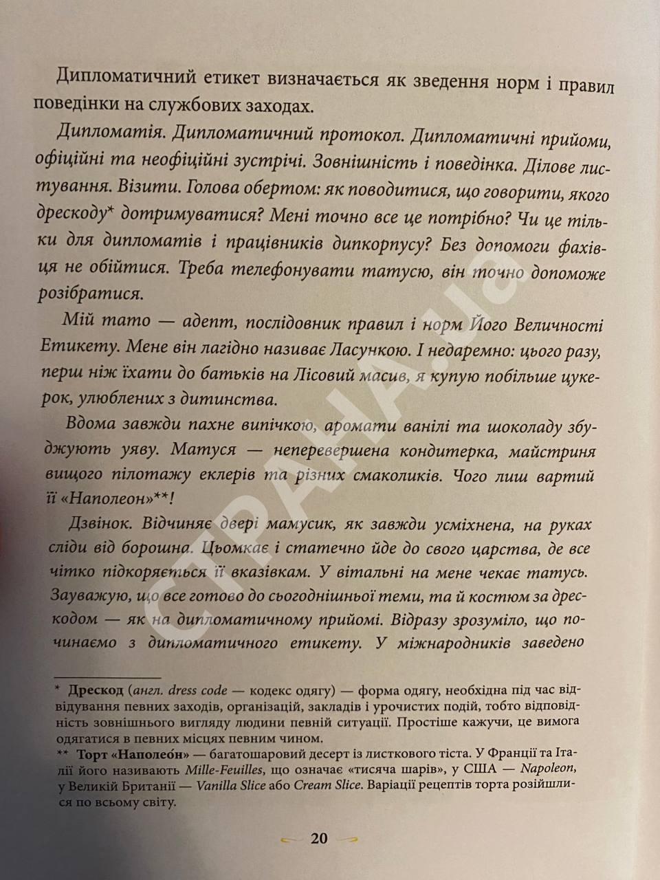 Если убрать из книги лирические отступления на тему ревности, сладостей и танцев (и дифирамбы отцу), останется только сухое перечисление общеизвестных фактов об этикете, напоминающее выдержки из "Википедии": "Дипломатический протокол — это…". Самое смешное, что в некоторых местах автор прямо ссылается на "Википедию": "Определение дресс-кода в Википедии звучит так:…".