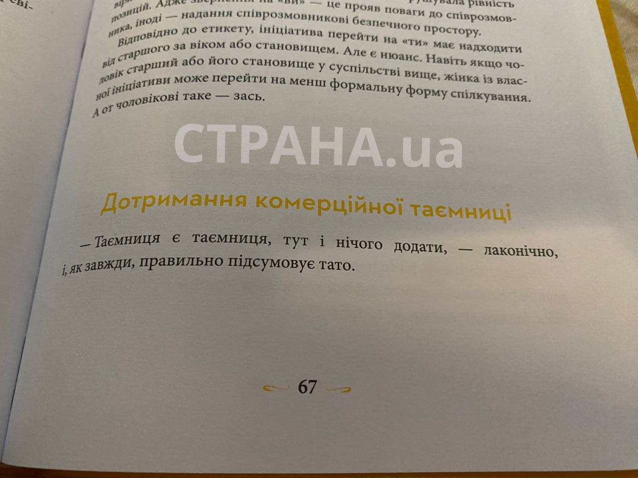 Судя по всему, выражение "краткость — сестра таланта" Оксана Датий восприняла чересчур буквально. Некоторые правила этикета она объясняет одной фразой. Так, в мини-разделе "Соблюдение коммерческой тайны" всего одна реплика: "Тайна есть тайна, тут и нечего добавить". Вот и вся глава про коммерческую тайну.