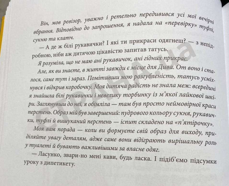 — Солнышко, теперь пора подготовить шпаргалку. И для тебя, и для молодого человека, которого ты от нас скрываешь. Ничего не говори, понимаю: счастье любит тишину, — эта реплика отца Оксаны Датий ни с того, ни с чего появляется посреди перечисления правил делового этикета.