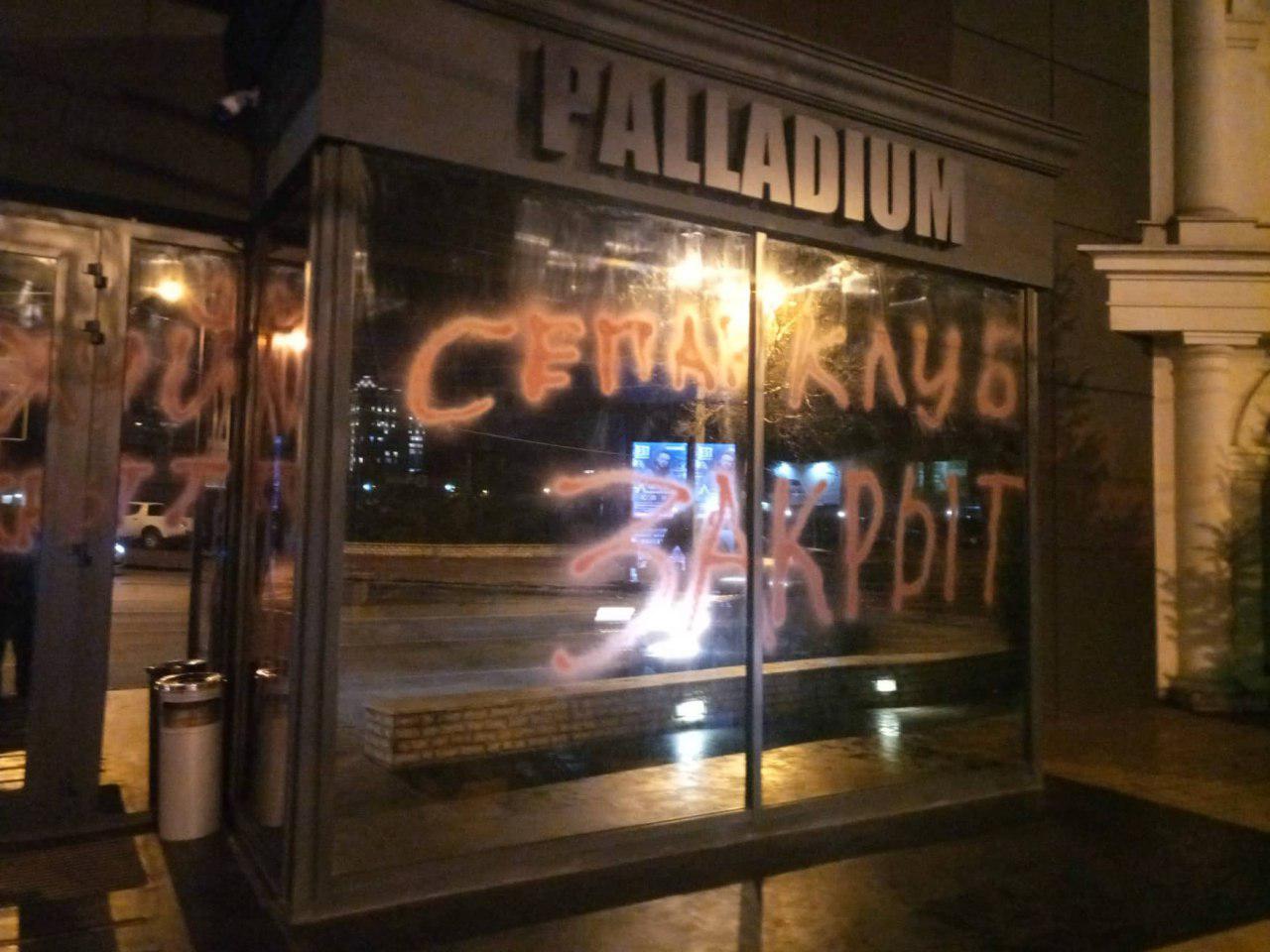Также они принесли под здание клуба автопокрышки и написали на окнах заведения "ху@ланы, сепары" и "сепар-клуб закрыт".