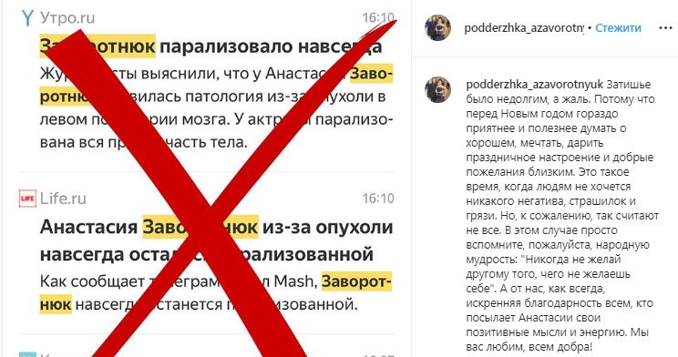 В посте публикации в различных медиа называют "выпадами прессы", на которые представителям приходится отвечать, чтобы минимизировать домыслы поклонников Заворотнюк.
