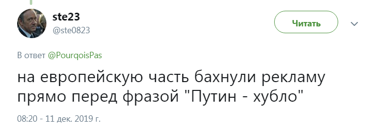 Как отмечают зрители, в эфире была заметна монтажная склейка. А пользователь микроблога Twitter с ником ste23 написал, что "на европейскую часть бахнули рекламу прямо перед фразой "Путин - хубло".