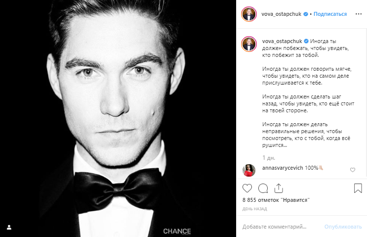 Владимир Остапчук обнародовал свое фото и философский пост в Instagram: "Иногда ты должен побежать, чтобы увидеть, кто побежит за тобой. Иногда ты должен говорить мягче, чтобы увидеть, кто на самом деле прислушивается к тебе. Иногда ты должен сделать шаг назад, чтобы увидеть, кто еще стоит на твоей стороне. Иногда ты должен делать неправильные решения, чтобы посмотреть, кто с тобой, когда все рушится..."