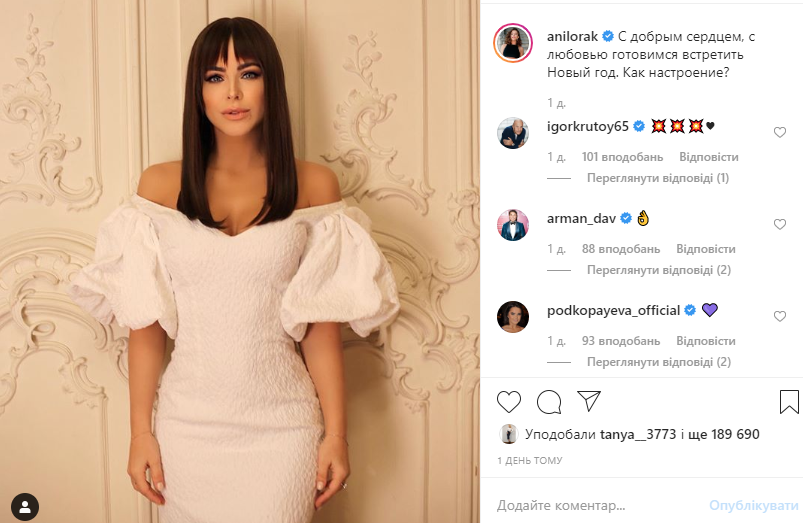 "С добрым сердцем, с любовью готовимся встретить Новый год. Как настроение?", - подписала свое новое фото Ани Лорак.