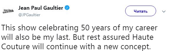 "Это будет большой праздник! Сейчас я должен тебе кое-что рассказать: это будет мое последнее дефиле от-кутюр, мое последнее шоу Gaultier Paris", - сказал он.