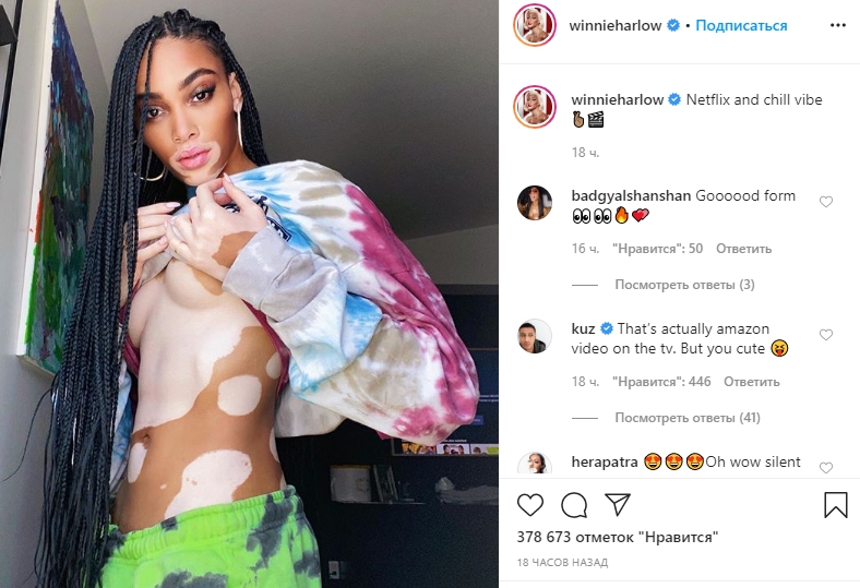 На снимке 25-летняя модель позирует в домашней одежде, волосы, заплетенные в косички в стиле афро. Харлоу приподняла толстовку и показала свою идеальную фигуру.