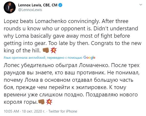 "Лопес побил Ломаченко убедительно. После трех раундов ты уже знаешь, кто твой соперник. Не понял, почему Лома отдал большую часть поединка, перед тем как завестись. Тогда уже было слишком поздно. Поздравляю нового царю горы", - написал Леннокс Льюис.