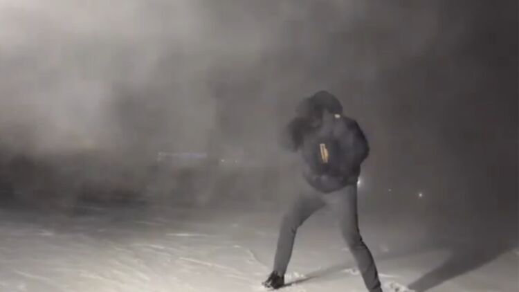 На видеоролике можно заметить, что украинский боксер "атакует" снежный пушечный поток вьюги.
