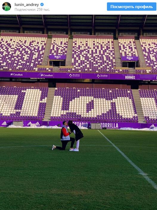 Вратарь "Вальядолида" Андрей Лунин сделал предложение своей девушке Анастасии на клубном стадионе "Нуэво Хосе Соррилья", о чем сообщил в своем Instagram.
