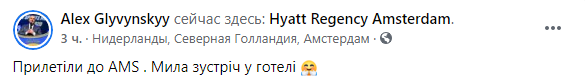 "Прилетели в AMS. Приятная встреча в отеле", - подписал обнародованные снимки в социальной сети Александр Гливинский.