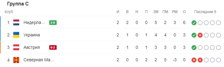 Украина в первом матче уступила Нидерландам на последних минутах. Во втором обыграла Северную Македонию - 2:1. Это позволило занять вторую строчку в группе с тремя очками.