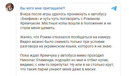 Алланазаров рассказал, что после игры ему удалось пробраться к автобусу "Бенфики" и немного поговорить с 25-летним Романом Яремчуком. При этом он добавил, что не знает украинского языка, а футболист отказался общаться на камеру на русском.