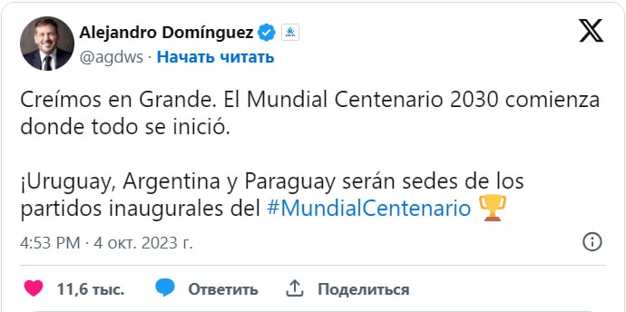 Об этом сообщил глава южноамериканской конфедерации футбола (КОНМЕБОЛ) Алехандро Домингес в соцсети Х.